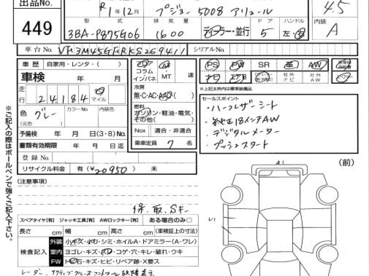 Купить ПЕЖО 5008 2019 года выпуска можно под заказ с аукционов Японии во Владивостоке с доставкой в Москву или любой другой город России.