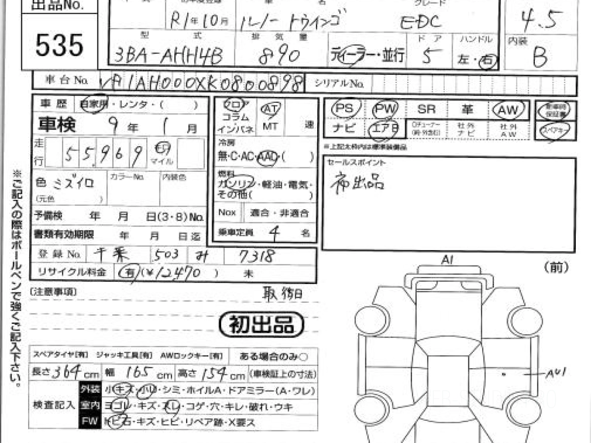 Купить РЕНО ТВИНГО 2019 года выпуска можно под заказ с аукционов Японии во Владивостоке с доставкой в Москву или любой другой город России.